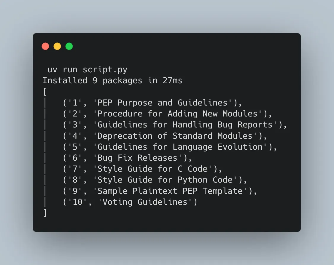 Then run uv run example.py and it will take care of running with the desired python version and requirements!