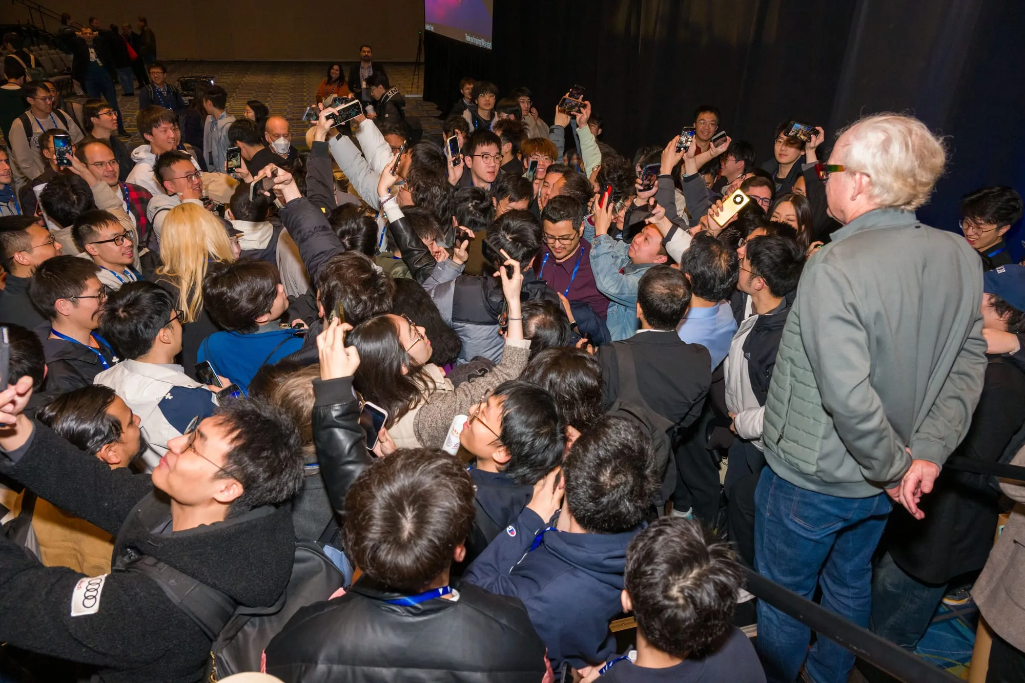 First, I skip most if not all presentations. Obviously there are great presentations and people put a lot of effort into them. I don’t want to deprive them of their audience, it’s not fun to present in an empty room. That said, they are often not worth the time to me. They are the least interactive/social part of a conference and you can just watch them online later! Unless you really want a selfie with the speaker, like this crowd around Andrew Ng (bonus challenge: try to find him lol). In that case, you need to attend I guess …